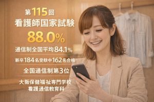 本日、第115回看護師国家試験の合格発表が行われました。 大阪保健福祉専門学校 看護通信教育科の合格率は88.0%! この数字は、全国にある通信制課程の中で全国第3位という素晴らしい成績でした!